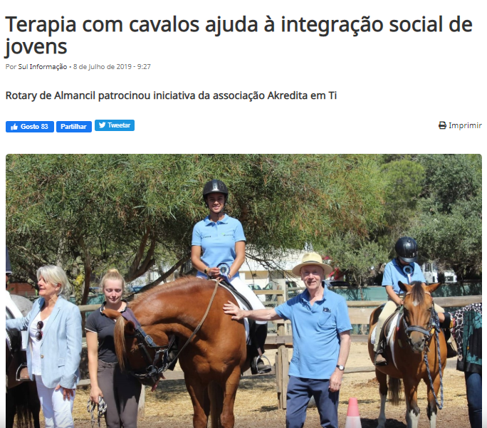 A associação juvenil Akredita em Ti promoveu uma demonstração pública de terapia assistida por cavalos no centro de equitação Pinetrees, em Vale do Lobo, Almancil na região do Algarve. Esta tinha como objetivos demonstrar a promoção da integração de regras sociais e desenvolvimento da autoestima através da relação com o animal.