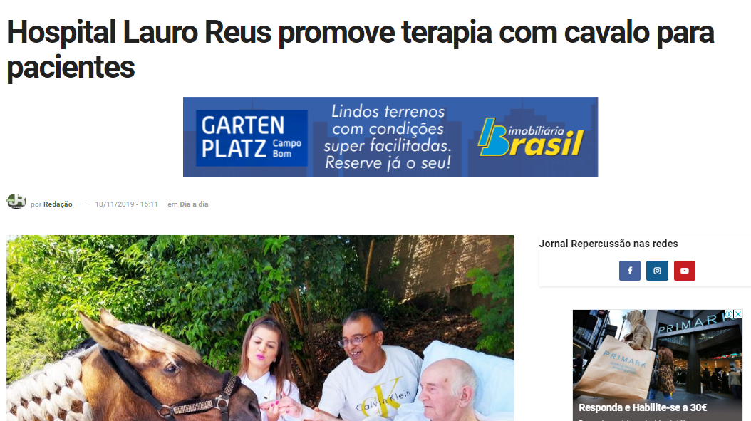 No Brasil o Hospital Lauro Reus em Campo Bom promove terapia com cavalo para pacientes. Projeto surge da parceria com o Centro Hípico Manège Metzler, que fornece o animal e o profissional responsável pela terapia uma vez por mês.