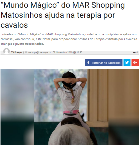 Entradas no "Mundo Mágico" no MAR Shopping Matosinhos este Natal até dia 6 de janeiro, vão contribuir para proporcionar sessões de Terapia assistida com Cavalos a crianças e jovens necessitados na IPSS Associação Equiterapêutica de Porto e Matosinhos