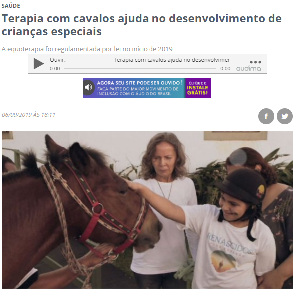 Noticia que acompanha uma visita ao Centro Elohim de equoterapia, na Zona Oeste do Recife, Brasil, fala sobre uma criança que pratica regularmente e os benefícios que esta terapia lhe traz.