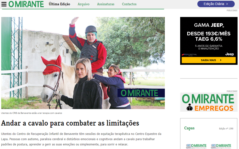 Andar a cavalo para combater as limitações. Este é o mote das sessões de equitação terapêutica no Centro Equestre da Lapa que os utentes do Centro de Recuperação Infantil de Benavente (CRIB) frequentam á já 2 anos, uma vez por semana.