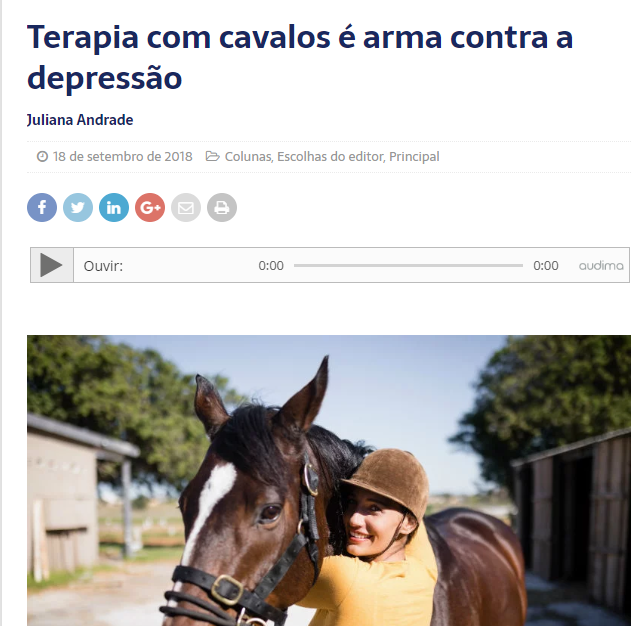 A Terapia com cavalos é arma contra a depressão, esta notícia fala da equitação terapeuta como tratamento para a depressão, a doença da nossa era, assim explora esta terapia e menciona cinco locais onde a pode praticar no Brasil.