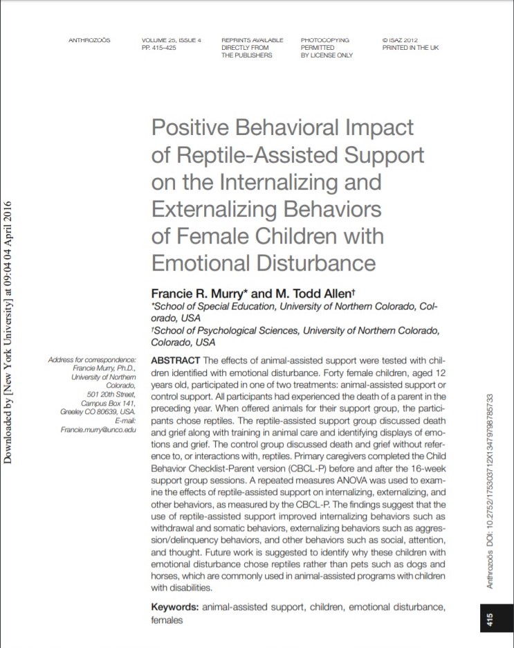 Murry, F., & Allen, M. (2012). Positive Behavioral Impact of Reptile-Assisted